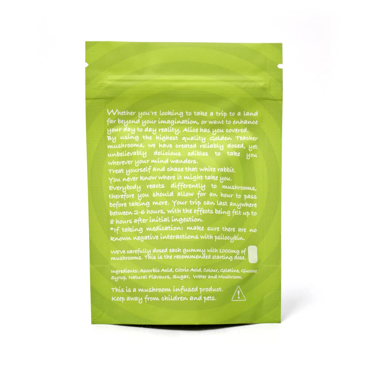 Whether you’re looking to take a trip to a land far beyond your imagination or want to enhance your day-to-day reality, Alice 2500mg Green Apple Gummy has you covered. By using the highest quality Psilocybin Mushrooms, we have created reliably dosed, yet unbelievably delicious edibles to take you wherever your mind wanders.